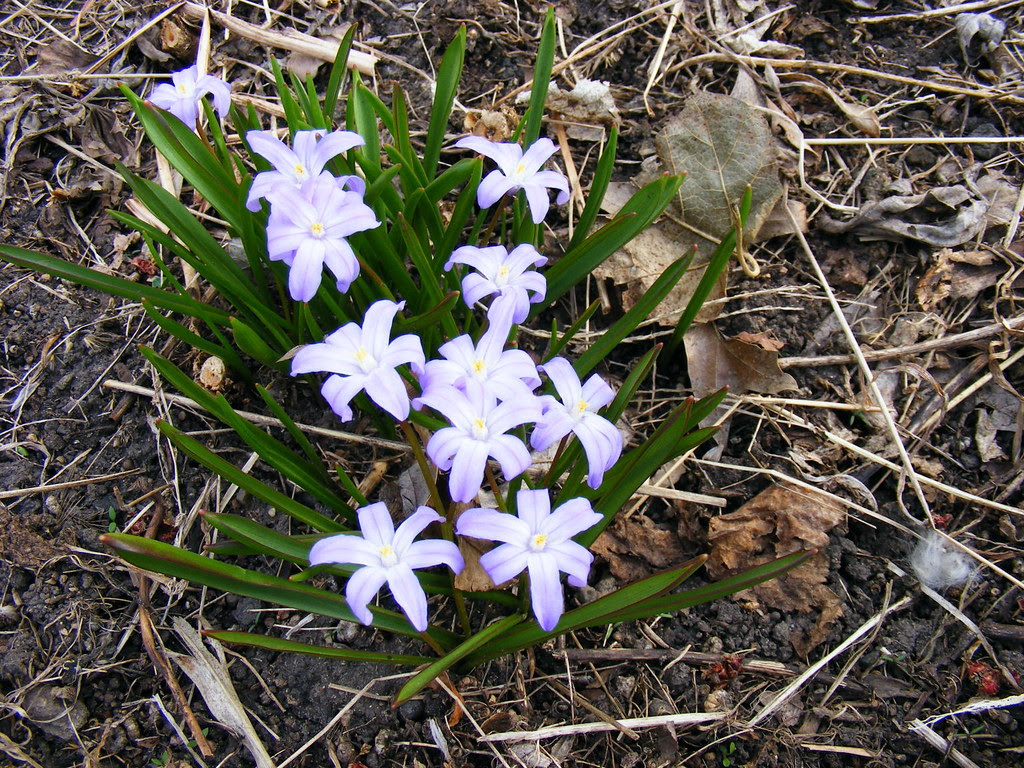 In any case, it appears that, like other small bulbs closer to the surface, it managed to escape the ravages visited upon the Tulips and Fritillarias due to the severity of last year's long, late freeze and this past winter's nastiness. In fact, it has definitely expanded its clump since last year, much to my delight. I definitely want to get some more of these planted this fall, as the original spots I planted only contained about 3-4 bulbs each (they're small), because they are definitely happy naturalizers. I think they'd make excellent companions for Snowdrops, Crocus and Squill, with their pale blue stars that gradually fade to almost a pale lavender (see second shot). They're not the easiest subjects to shoot (at least for me!) ... not enough light and they look 'muddy blue' and too much sun makes them look bleached out. Just one of those flowers that needs to be seen in situ to truly appreciate the delicate hues of blue they exhibit ...
